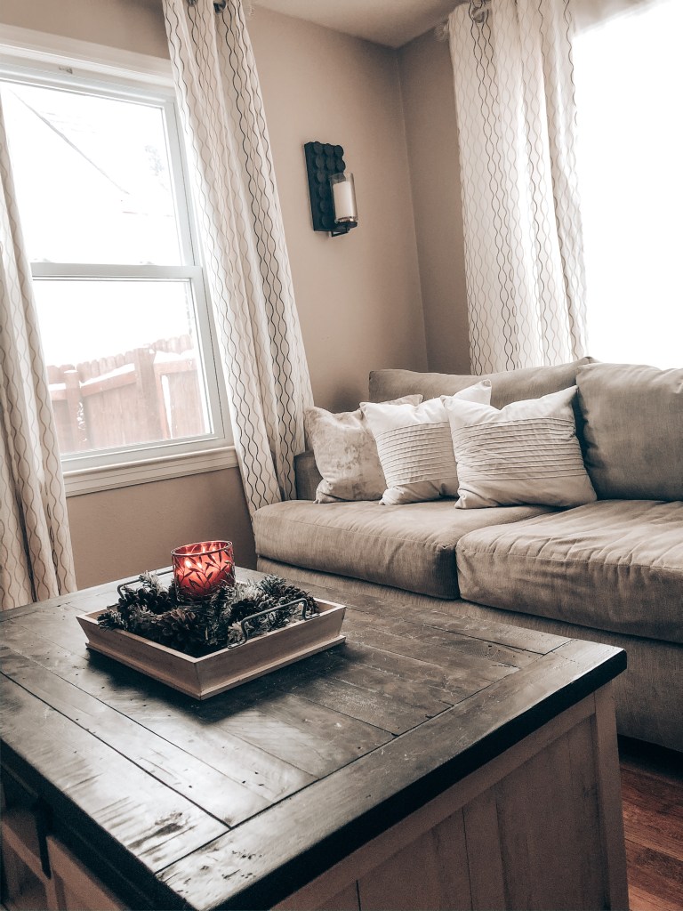 For the windows, I wanted a sheer, neutral curtain. I added these sheer white and beige curtains from Ikea. They have a simple pattern on them that matched our neutral walls, and they set the stage for all of the other colorful items.